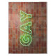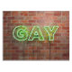 SlipperyJoe illuminated gay neon sign bright vivid electric green lights letters mounted reddish-brown brick wall gay pride gifts identity celebration LGBTQIA urban industrial look celebration love identity community live your truth visibility power vibrant glow contrasts textured backdrop sleek electric curves artistic casting lively aura