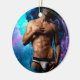 SlipperyJoe muscular man underwear bulge vibrant hues blue teal purple cloud-like abstraction gay pride gifts LGBTQIA artistic dreamlike abstract energy psychedelic surrealism cosmic effect surreal and imaginative background hand rests over chest