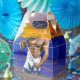 SlipperyJoe's muscular man bulge six-pack gym training facility white athletic singlet blue red ropes hanging from ceiling pulling spandex away from body gay pride gifts LGBTQIA artistic wrestling mat yellow circles padded walls line the room fluorescent lights cast stark glow
