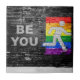 SlipperyJoe's rainbow pride colors panel urban street art style scene gritty industrial alleyway feel artistic graffiti aesthetic LGBTQIA gifts text appearing faded stencil applied white pedestrian walking symbol figure appears midstep arm swinging gray concrete sidewalk rectangular stone dark weathered painted brick wall public mural encouraging individuality self-expression red orange yellow green blue purple dramatic lighting creating spotlight effect