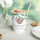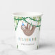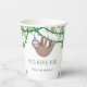 Celebrate your kiddo's birthday with these cute sloth birthday party paper cups! With an adorable, hand-painted sloth in a blue and white polka dot party hat hanging around in the jungle. Swinging vines and jungle leaves decorate the background