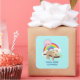 A colourful rainbow behind him along with a pink sun hovering over head. Cute, adorable and trendy.