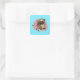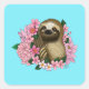 A cute sloth sitting amongst pink flowers against a backdrop of blue