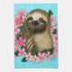 A cute sloth sitting amongst pink flowers against a backdrop of blue