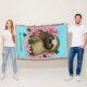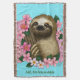 A cute sloth sitting amongst pink flowers against a backdrop of blue