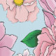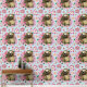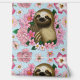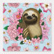 A cute sloth sitting amongst pink flowers in a backdrop of blue