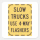 A slow trucks road sign that says use 4-way flashers. This design looks really effective on these Stickers