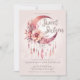 An enchanting watercolor illustration featuring a dreamy pink moon with a dreamcatcher and floral decorations, as well as pink crystals, painted in watercolor with gold glitter accents (these are digital effects, not real foil), decorates this elegant Sweet 16 slumber party invitation. A perfect choice for the boho-chic enthusiast who adores crystals, the moon, and the charm of slumber parties. Make your celebration truly special with this uniquely artistic and dreamy invitation.