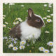 A simple, cute, lone rabbit casually nibbling on some fresh greens; surrounded by cute white daisy flowers.