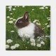 A simple, cute, lone rabbit casually nibbling on some fresh greens; surrounded by cute white daisy flowers.