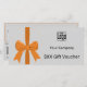 The design includes a decorative ribbon on a confetti background, with the company’s custom logo and name displayed prominently on the right. Beneath this, the voucher value is clearly presented.
