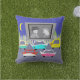 Pass the popcorn! This Small Town Drive-In Movie Outdoor Pillow will transport you to a simpler time, when gas was cheap, rock and roll was young, and the movie stars of Hollywood's Golden Age shined brighter than the night sky. The design features the rear view of five, virtually indestructible, retro cars in colours of red, pink, turquoise, jade and yellow. In front of the cars is a giant movie screen, showing a black and white movie, featuring two, star-crossed lovers in hats and trench coats. In the background, there is a grey, picket fence, a row of green, cedar trees, a royal blue sky and a yellow, crescent moon. We hope you've enjoyed our feature presentation!