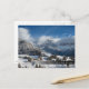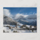 Postcard of the small village Sankt Magdalena in Villnoess valley with the Geisler Dolomites mountain peaks in the background covered in snow in winter season in South Tyrol, Italy with a fading black bar and the text 'Val di Funes'.