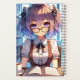 Anime Girl with purple eyes in Glasses at the Library reading books in a cute dress with cat ears headphones.