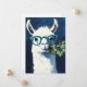 Playful twist to cute animal art and humour with a quirky white llama rocking teal glasses and holding a leafy branch.