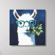 Playful twist to cute animal art and humour with a quirky white llama rocking teal glasses and holding a leafy branch.