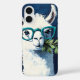 Playful twist to cute animal art and humour with a quirky white llama rocking teal glasses and holding a leafy branch.