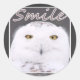Image of a snowy owl photographed in Hampden, Maine. The snowy appears to be smiling for me as I snap the shot.