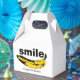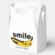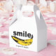 Graphic art: Banana orientated to form a smile + small text between brackets: (is good for health). Perfect for anyone who keeps smiling year after year. Design on cube favour box. You can easily add text and change font, colour, size and position by clicking the customise button. Available in take-out favour box for texts for birthday to customise. Matching birthday invitation, birthday guest books (hard cover and spiral notebook), birthday paper napkin, paper plate and more...