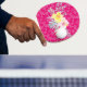 Pink background with hibiscus pattern, back face with Smaile! Designed the logo.