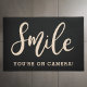 Doormat featuring the text "Smile you're on camera". Neutral light brown text on black background. All colours are customisable.
