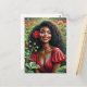 Share a burst of beauty and joy with this stunning strawberry field postcard, featuring a radiant woman in a vivid red dress surrounded by lush green leaves, ripe strawberries, and bright blossoms. Her warm smile, thick curly hair, and the delicate flower tucked in her hair create a captivating portrait that celebrates both nature’s abundance and feminine elegance.