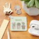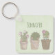 A key chain with a whimsical design. 3 cute cactus all in a row with smiling faces sitting in a flowerpot each wearing some jewellery.