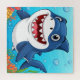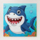 Cute artistic portrayal of a grinning blue shark in an underwater setting surrounded by vibrant coral.