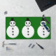 This awesome desk mat features a smiling white Christmas snowman with black buttons and a top hat. He looks like one cool gent and would love to help you spread the joy of Christmas this year. The background is a festive shade of green.