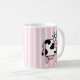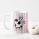 A fun girly animal print design with a smiling cow against a wide striped background in pink and white.