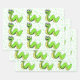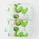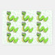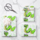 This set of wrapping paper sheets have a repeated image of smiling cute snake who is neon green with a yellow stomach on a white background with vibrant green polka dots.