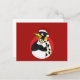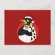 Postcard with an illustration of a cute happy emperor penguin with a red Santa hat; Christmas holiday cartoon design for kids, on a red background