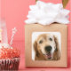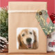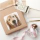 These square stickers feature a photograph of a smiling golden retriever dog, in portrait.