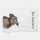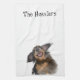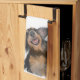 An adorable long haired dachshund smiles engagingly . Personalise the towel with your name or saying. Original art by Leah Wiedemer