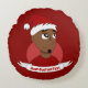 Round pillow with an illustration of happy smiling African American man with Santa Claus' hat; with editable text template; Christmas holidays design with a red background
