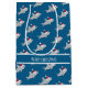A gift bag with a pattern of smiling, cartoon, sharks wearing Santa hats and the customisable words ‘Merry Christmas’.