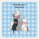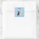 This square sticker bookplate label is a light blue and white plaid pattern with a smiling white mother cat sitting with her three cute kittens who are black, white, and grey all wearing pink ribbons. Customise your text with the templates.