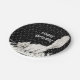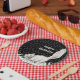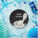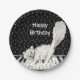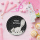 This paper plate has a smiling white cat walking on piano keys while winking on a black background with various white music notes. Customise the Happy Birthday text with the templates.