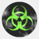 Black sticker with green biohazard symbol surrounded by puffs of smoke.