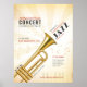 Customize this trumpet/music event advert poster with your info. Subtle musical notes and piano/keyboard keys are featured in the background.
