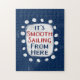 Bold text reading "Smooth Sailing From Here" is centred against a navy blue background. The red and blue text sits on a white rectangle with large textured white dots around it, providing a playful contrast against the solid colour backdrop.