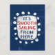 Bold text reading "Smooth Sailing From Here" is centred against a navy blue background. The red and blue text sits on a white rectangle with large textured white dots around it, providing a playful contrast against the solid colour backdrop.