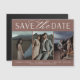 A modern save the date magnet designed to accommodate 3 vertical photos aligned side by side. "Save the date" appears across the top in chic block and script lettering, with your names, wedding date and wedding location beneath, along with your wedding website or additional details.