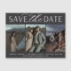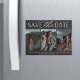 A modern save the date magnet designed to accommodate 3 vertical photos aligned side by side. "Save the date" appears across the top in chic block and script lettering, with your names, wedding date and wedding location beneath, along with your wedding website or additional details.
