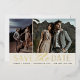 A modern save the date card designed to accommodate two engagement photo (one vertical and one horizontal, aligned side by side). "Save the date" appears beneath your photos in gold foil block and script lettering, along with your names, wedding date and wedding location. Personalise the back with additional details, such as your wedding website.