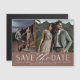 A modern save the date magnet designed to accommodate two engagement photos aligned side by side. "Save the date" appears beneath your photos in chic block and script lettering, with your names, wedding date and wedding location beneath, along with your wedding website or additional details.