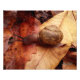 A large snail crosses a bed of autumn leaves.