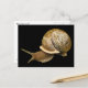 This postcard features a garden snail emerging from his shell on a black background. He is a terrestrial gastropod mollusk with a brown and beige shell in the classic spiral pattern. His tentacles each have an eye at the end and are pointing ahead as he figures out where to go, pushed along by his strong muscular foot.
