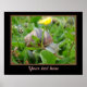 This beautiful animal poster has a close up photograph of a snail, with a yellow flower in the background. It's among some grass and plants.