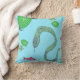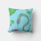 Snake Throw Pillow with an animated print featuring snakes, frogs, fish and green leaves. The bright and dynamic design brings to life, with the animated characters seemingly coming alive. Snakes coil around frogs and fish. The colour palette includes vibrant shades of green, blue, and red. These Snake Throw Pillow are perfect for all Holidays.